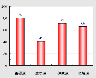 成功運 目的に対する成功運の強さをあらわします。この点数が高いほど自分の思い通りに成功し、逆に悪いと逆境・批判・障害などに苦心します。 41点