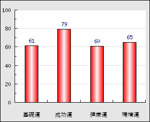 環境運 家庭や職場等での援助運・環境運を司ります。これが良いと配偶者や子供・職場の同僚などから助力が得られやすく、悪いと波乱・不和・孤独などがあります。 65点