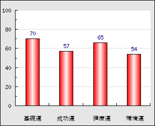 環境運 家庭や職場等での援助運・環境運を司ります。これが良いと配偶者や子供・職場の同僚などから助力が得られやすく、悪いと波乱・不和・孤独などがあります。 54点