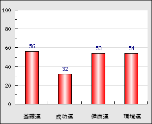 環境運 家庭や職場等での援助運・環境運を司ります。これが良いと配偶者や子供・職場の同僚などから助力が得られやすく、悪いと波乱・不和・孤独などがあります。 54点