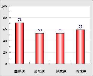 成功運 目的に対する成功運の強さをあらわします。この点数が高いほど自分の思い通りに成功し、逆に悪いと逆境・批判・障害などに苦心します。 53点