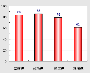 成功運 目的に対する成功運の強さをあらわします。この点数が高いほど自分の思い通りに成功し、逆に悪いと逆境・批判・障害などに苦心します。 86点