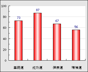 成功運 目的に対する成功運の強さをあらわします。この点数が高いほど自分の思い通りに成功し、逆に悪いと逆境・批判・障害などに苦心します。 87点