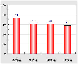 成功運 目的に対する成功運の強さをあらわします。この点数が高いほど自分の思い通りに成功し、逆に悪いと逆境・批判・障害などに苦心します。 61点