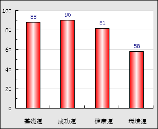 成功運 目的に対する成功運の強さをあらわします。この点数が高いほど自分の思い通りに成功し、逆に悪いと逆境・批判・障害などに苦心します。 90点