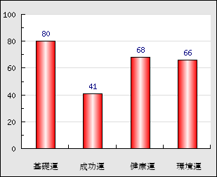 成功運 目的に対する成功運の強さをあらわします。この点数が高いほど自分の思い通りに成功し、逆に悪いと逆境・批判・障害などに苦心します。 41点