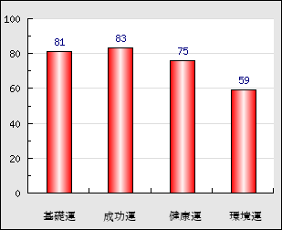 環境運 家庭や職場等での援助運・環境運を司ります。これが良いと配偶者や子供・職場の同僚などから助力が得られやすく、悪いと波乱・不和・孤独などがあります。 59点