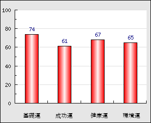 環境運 家庭や職場等での援助運・環境運を司ります。これが良いと配偶者や子供・職場の同僚などから助力が得られやすく、悪いと波乱・不和・孤独などがあります。 65点