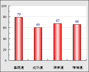 環境運 家庭や職場等での援助運・環境運を司ります。これが良いと配偶者や子供・職場の同僚などから助力が得られやすく、悪いと波乱・不和・孤独などがあります。 66点
