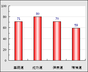 成功運 目的に対する成功運の強さをあらわします。この点数が高いほど自分の思い通りに成功し、逆に悪いと逆境・批判・障害などに苦心します。 80点