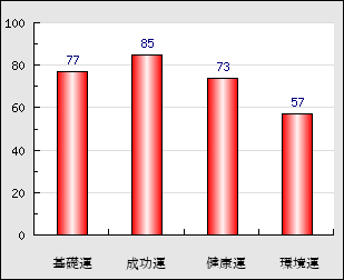 環境運 家庭や職場等での援助運・環境運を司ります。これが良いと配偶者や子供・職場の同僚などから助力が得られやすく、悪いと波乱・不和・孤独などがあります。 57点