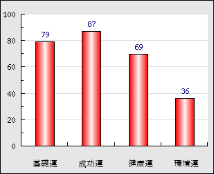成功運 目的に対する成功運の強さをあらわします。この点数が高いほど自分の思い通りに成功し、逆に悪いと逆境・批判・障害などに苦心します。 87点