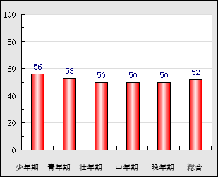 ※年代別運勢グラフは、あくまでも時期別の運勢を概算したものですので参考程度にご覧ください。少年期や青年期の運勢が平均と比べて高い場合は比較的若い頃に成功や幸福があり、反対に中年期や晩年期の運勢が平均と比べて高い場合は後年に華開く大器晩成型と言えるでしょう。ただし、少年期の運勢が低いからと言って、若い頃は成功しないといったことではありません。