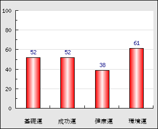 成功運 目的に対する成功運の強さをあらわします。この点数が高いほど自分の思い通りに成功し、逆に悪いと逆境・批判・障害などに苦心します。 52点