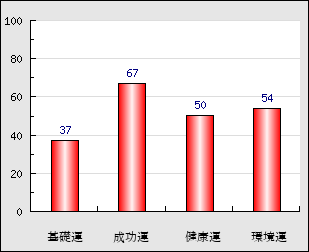 成功運 目的に対する成功運の強さをあらわします。この点数が高いほど自分の思い通りに成功し、逆に悪いと逆境・批判・障害などに苦心します。 67点