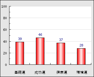 成功運 目的に対する成功運の強さをあらわします。この点数が高いほど自分の思い通りに成功し、逆に悪いと逆境・批判・障害などに苦心します。 46点