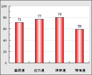 環境運 家庭や職場等での援助運・環境運を司ります。これが良いと配偶者や子供・職場の同僚などから助力が得られやすく、悪いと波乱・不和・孤独などがあります。 59点