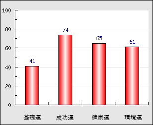 成功運 目的に対する成功運の強さをあらわします。この点数が高いほど自分の思い通りに成功し、逆に悪いと逆境・批判・障害などに苦心します。 74点