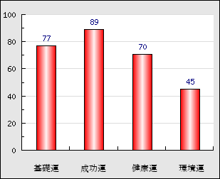 環境運 家庭や職場等での援助運・環境運を司ります。これが良いと配偶者や子供・職場の同僚などから助力が得られやすく、悪いと波乱・不和・孤独などがあります。 45点