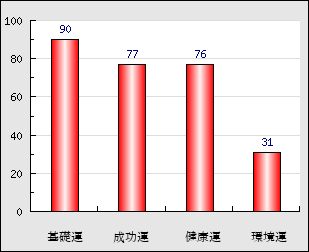 成功運 目的に対する成功運の強さをあらわします。この点数が高いほど自分の思い通りに成功し、逆に悪いと逆境・批判・障害などに苦心します。 77点