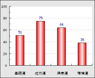 成功運 目的に対する成功運の強さをあらわします。この点数が高いほど自分の思い通りに成功し、逆に悪いと逆境・批判・障害などに苦心します。 75点