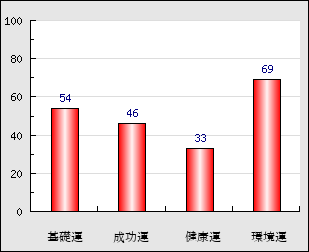 環境運 家庭や職場等での援助運・環境運を司ります。これが良いと配偶者や子供・職場の同僚などから助力が得られやすく、悪いと波乱・不和・孤独などがあります。 69点