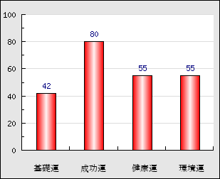 成功運 目的に対する成功運の強さをあらわします。この点数が高いほど自分の思い通りに成功し、逆に悪いと逆境・批判・障害などに苦心します。 80点