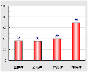 成功運 目的に対する成功運の強さをあらわします。この点数が高いほど自分の思い通りに成功し、逆に悪いと逆境・批判・障害などに苦心します。 35点