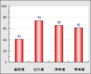 成功運 目的に対する成功運の強さをあらわします。この点数が高いほど自分の思い通りに成功し、逆に悪いと逆境・批判・障害などに苦心します。 74点