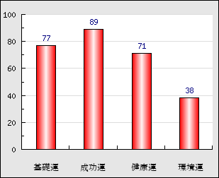 成功運 目的に対する成功運の強さをあらわします。この点数が高いほど自分の思い通りに成功し、逆に悪いと逆境・批判・障害などに苦心します。 89点