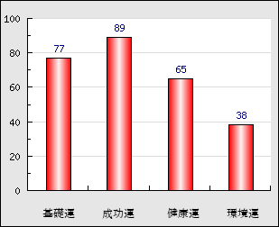 成功運 目的に対する成功運の強さをあらわします。この点数が高いほど自分の思い通りに成功し、逆に悪いと逆境・批判・障害などに苦心します。 89点