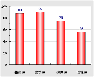 成功運 目的に対する成功運の強さをあらわします。この点数が高いほど自分の思い通りに成功し、逆に悪いと逆境・批判・障害などに苦心します。 90点