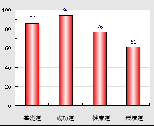 成功運 目的に対する成功運の強さをあらわします。この点数が高いほど自分の思い通りに成功し、逆に悪いと逆境・批判・障害などに苦心します。 94点