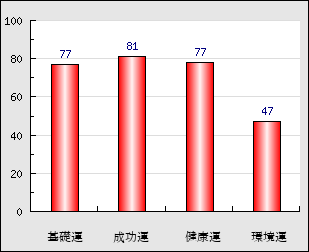 環境運 家庭や職場等での援助運・環境運を司ります。これが良いと配偶者や子供・職場の同僚などから助力が得られやすく、悪いと波乱・不和・孤独などがあります。 47点