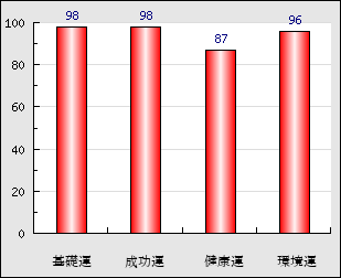 | 環境運 | 家庭や職場等での援助運・環境運を司ります。これが良いと配偶者や子供・職場の同僚などから助力が得られやすく、悪いと波乱・不和・孤独などがあります。 | 96点 |