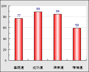 環境運 家庭や職場等での援助運・環境運を司ります。これが良いと配偶者や子供・職場の同僚などから助力が得られやすく、悪いと波乱・不和・孤独などがあります。 59点