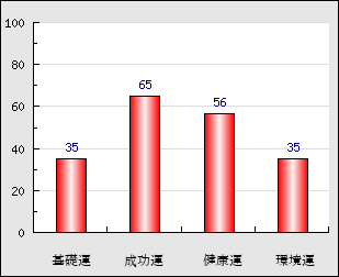 成功運 目的に対する成功運の強さをあらわします。この点数が高いほど自分の思い通りに成功し、逆に悪いと逆境・批判・障害などに苦心します。 65点