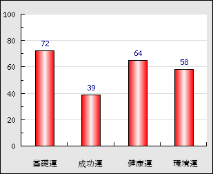 成功運 目的に対する成功運の強さをあらわします。この点数が高いほど自分の思い通りに成功し、逆に悪いと逆境・批判・障害などに苦心します。 39点