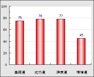 環境運 家庭や職場等での援助運・環境運を司ります。これが良いと配偶者や子供・職場の同僚などから助力が得られやすく、悪いと波乱・不和・孤独などがあります。 45点