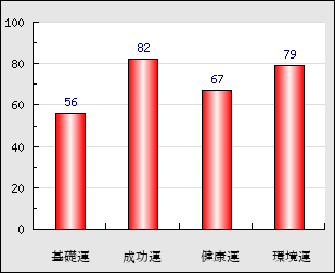 成功運 目的に対する成功運の強さをあらわします。この点数が高いほど自分の思い通りに成功し、逆に悪いと逆境・批判・障害などに苦心します。 82点