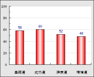 成功運 目的に対する成功運の強さをあらわします。この点数が高いほど自分の思い通りに成功し、逆に悪いと逆境・批判・障害などに苦心します。 60点