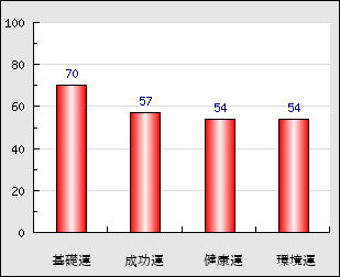 環境運 家庭や職場等での援助運・環境運を司ります。これが良いと配偶者や子供・職場の同僚などから助力が得られやすく、悪いと波乱・不和・孤独などがあります。 54点
