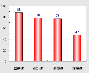 環境運 家庭や職場等での援助運・環境運を司ります。これが良いと配偶者や子供・職場の同僚などから助力が得られやすく、悪いと波乱・不和・孤独などがあります。 47点