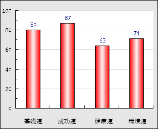 成功運 目的に対する成功運の強さをあらわします。この点数が高いほど自分の思い通りに成功し、逆に悪いと逆境・批判・障害などに苦心します。 87点