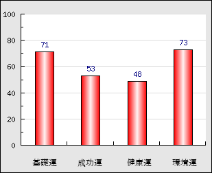 環境運 家庭や職場等での援助運・環境運を司ります。これが良いと配偶者や子供・職場の同僚などから助力が得られやすく、悪いと波乱・不和・孤独などがあります。 73点