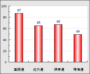 成功運 目的に対する成功運の強さをあらわします。この点数が高いほど自分の思い通りに成功し、逆に悪いと逆境・批判・障害などに苦心します。 65点