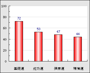 成功運 目的に対する成功運の強さをあらわします。この点数が高いほど自分の思い通りに成功し、逆に悪いと逆境・批判・障害などに苦心します。 53点