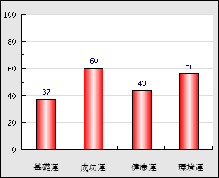 成功運 目的に対する成功運の強さをあらわします。この点数が高いほど自分の思い通りに成功し、逆に悪いと逆境・批判・障害などに苦心します。 60点