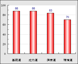 成功運 目的に対する成功運の強さをあらわします。この点数が高いほど自分の思い通りに成功し、逆に悪いと逆境・批判・障害などに苦心します。 88点