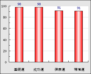 成功運 目的に対する成功運の強さをあらわします。この点数が高いほど自分の思い通りに成功し、逆に悪いと逆境・批判・障害などに苦心します。 98点